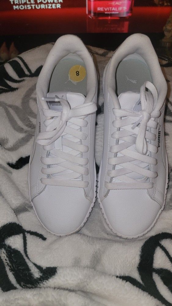 Ladies silver on white Puma tennis shoes Size 8 and worn handful of times I accept cash venmo or CashApp Delivery and shipping are not available