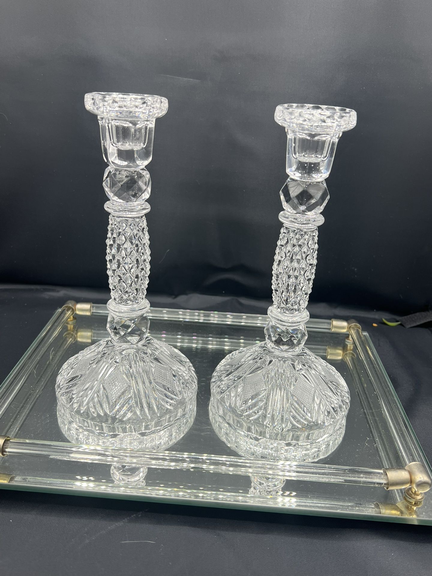VTG Elegant Crystal Diamond Cut 8.25" Pair of Candlestick Holders EUC Elegant pair of 8.25” Crystal Candlesticks, featuring intricate cuts and a tim