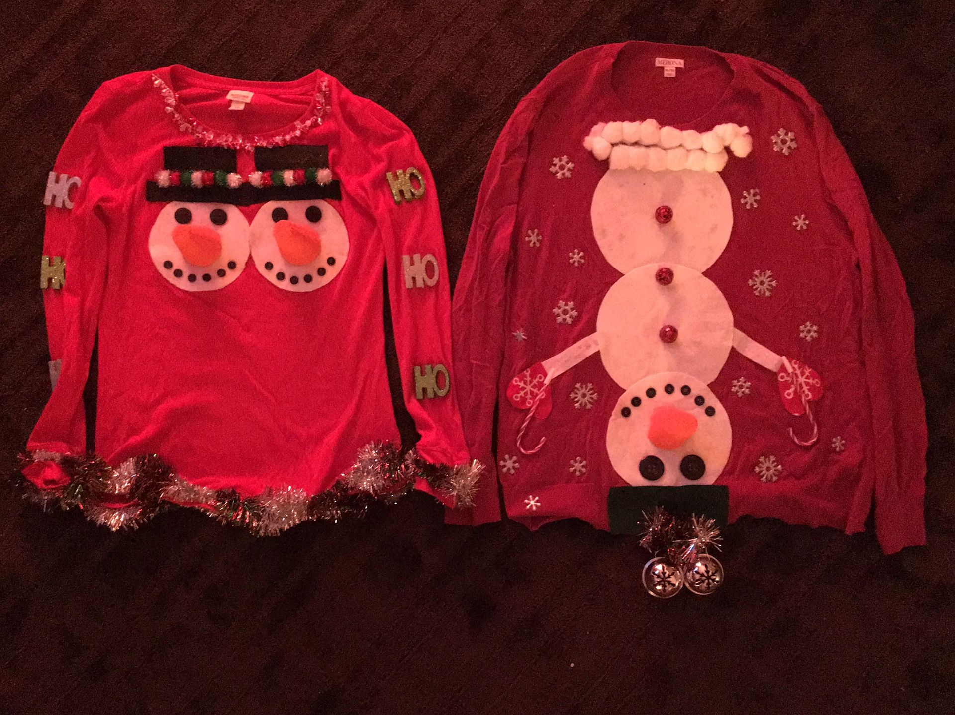 Very funny and “Award Winning” at an ugly Christmas sweater party. Men’s is an XL and Woman’s is an LG. I bought plain sweaters and added all the decorations.