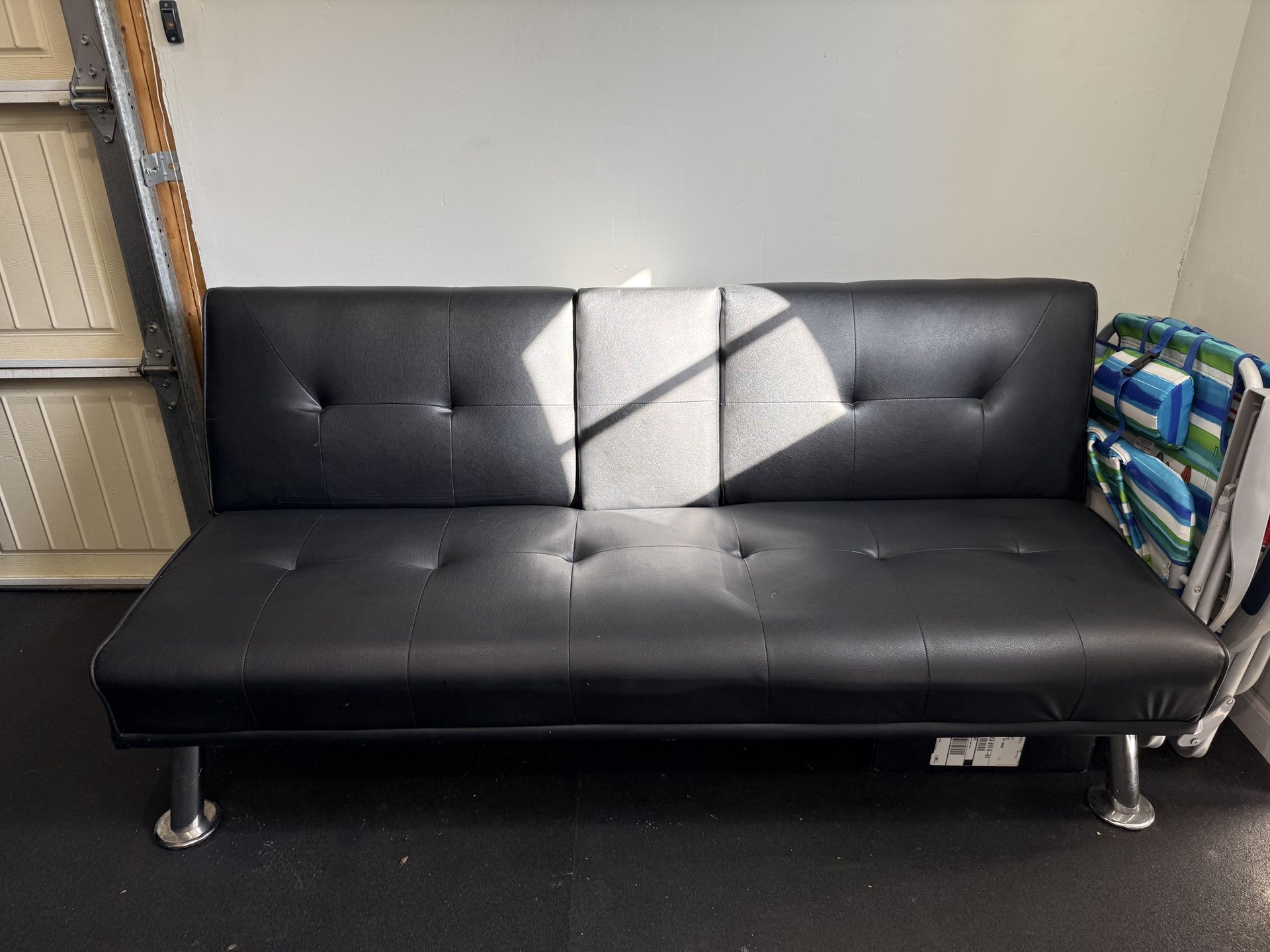 Faux Leather Upholstered Convertible Folding Futon Sofa Bed 2 Cupholders. light marks but in good condition; please refer to the photos. Color: black. Original Cost $321 at Home Depot.