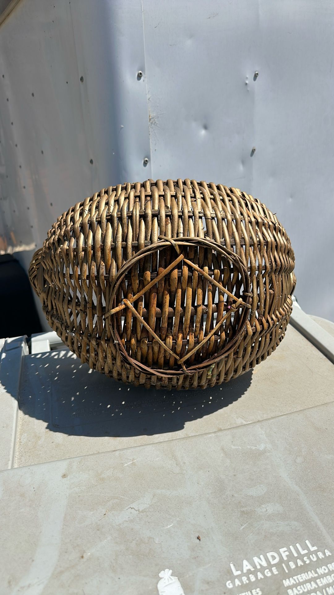 Handmade wicker basket with wooden branch handle. 14” wide by 16”long by 15” tall