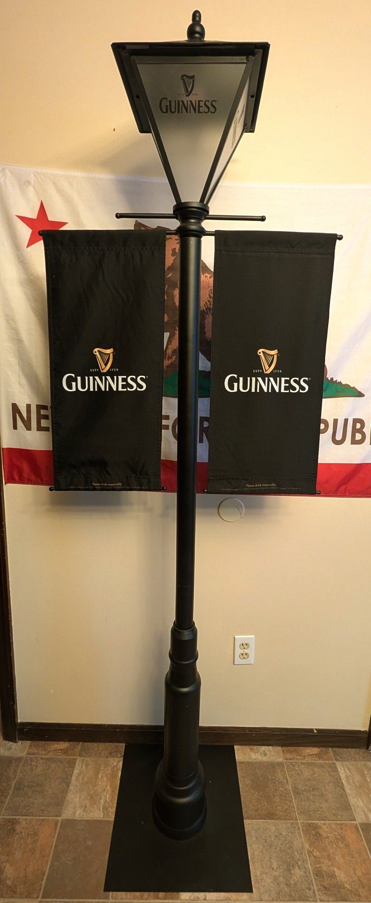 Rare find. 2014 Guinness Beer display lamp. Great for an Irish pub or bar display, or someone's man cave. About 7 feet tall and a little over 2 feet wide. Metal(aluminum most likely), with cloth Guinness banners or flags. LED lamp in the top has solid and flicker modes. Very soft lighting. Runs on AA batteries but could easily be converted to wired.