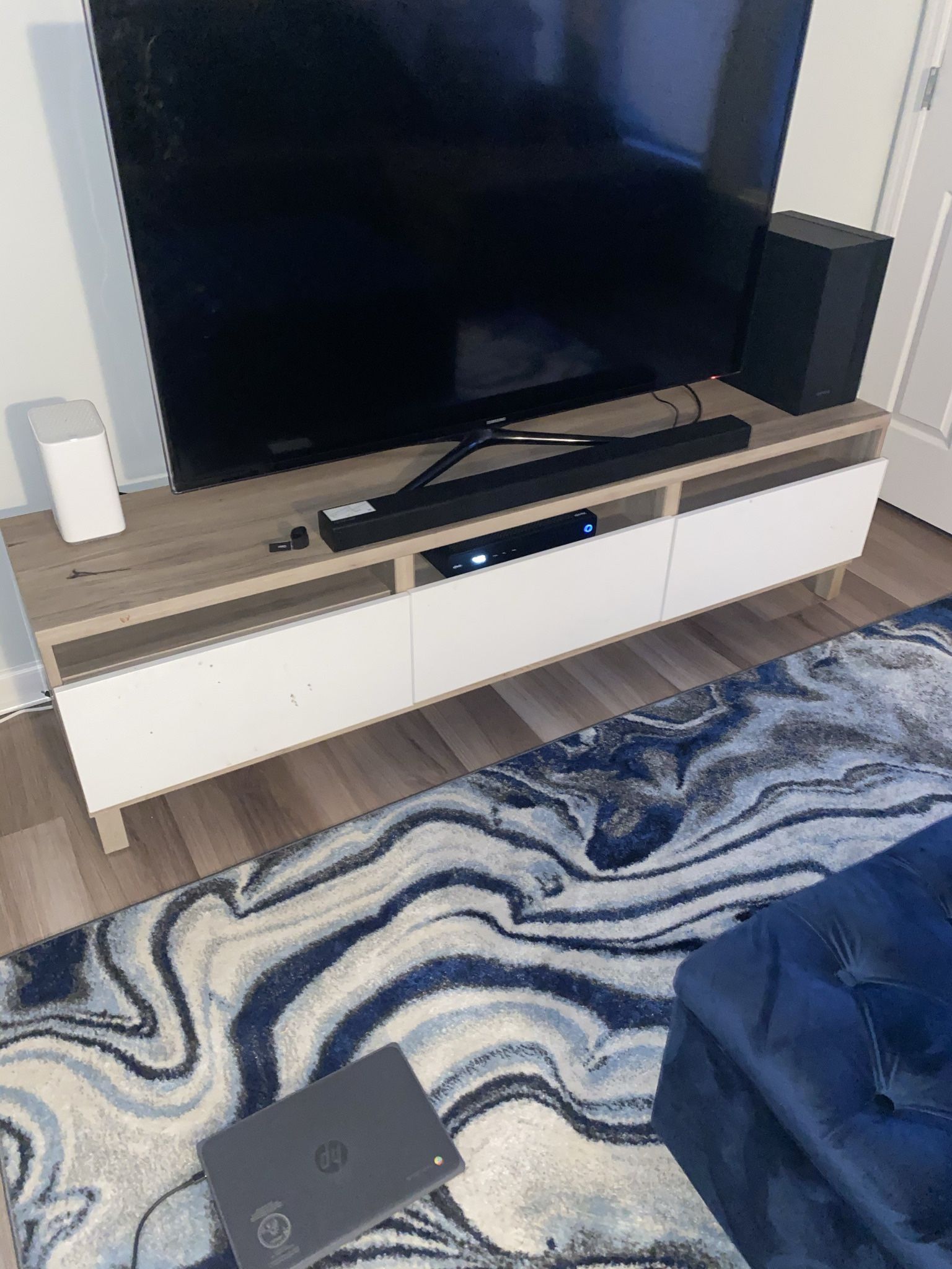 White/Oak tv stand with 3 smooth sliding pull out drawers. The unit is in good condition aside from a burn mark on the left side. I’ve been covering it with a candle which has been working great lol.