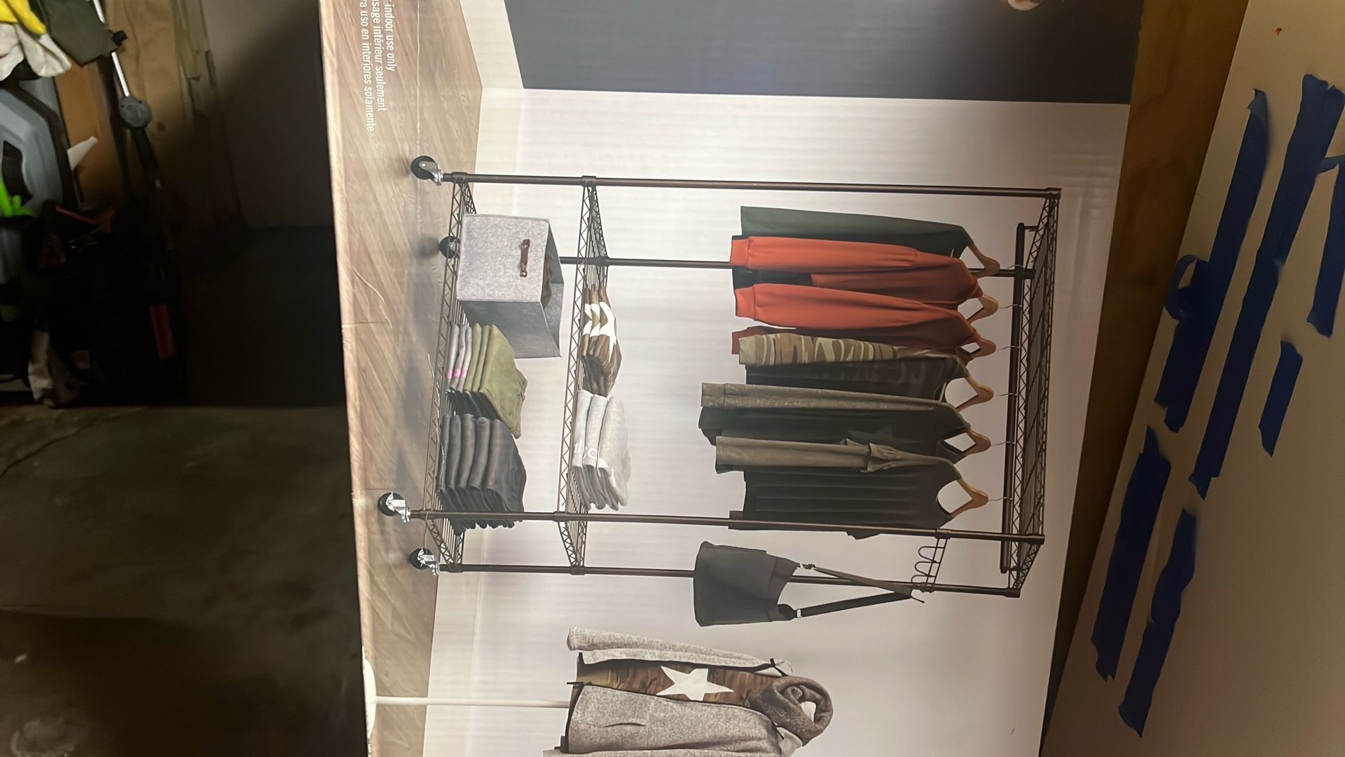 Rolling garment rack for laundry rooms, closets, office, etc. Uses : Wire rack storage shelves Bar for hangers Hooks for belts or purses Bottom shelf for shoes