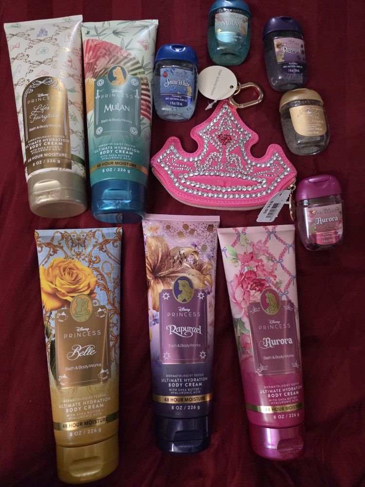 You get 11 items all brand new sealed never used only $65 dollars, everything is listed below. If you want to buy seperate thats fine as well 1. Aurora (sleeping beauty) ultimate hydration body cream worth $20 1. Repunzel ultimate hydration body cream worth $20 1. Belle ultimate hydration body cream worth $20 1. Lifes a fairytale ultimate hydration body cream worth $20 1. Mulan ultimate hydration body cream worth $20 asking 1 Aurora crown coin purse worth $18 free with purchase. 1 aurora pocketbac sanitizer 1 lifes a fairytale pocketbac sanitizer 1 Mulan pocketbac sanitizer 1 snow white pocketbac sanitizer 1 rapunzel pocketbac sanitizer