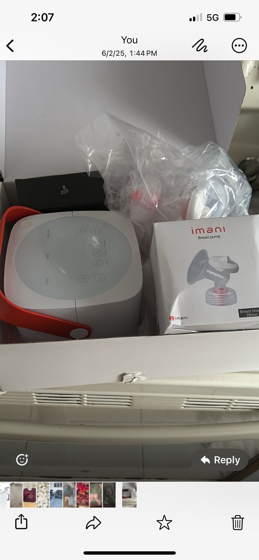 Imani breast pump with attachments never used because I made so much milk. Comes with some breast milk bags and other attachments