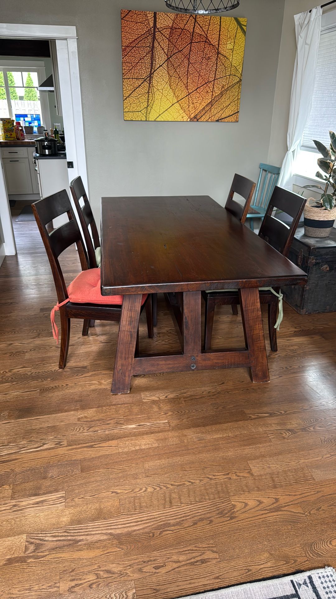 Solid wood table from Crate and Barrel, dark brown, 4 matching chairs. 30” high, 38” wide and 78” long. Comfortably seats 6.