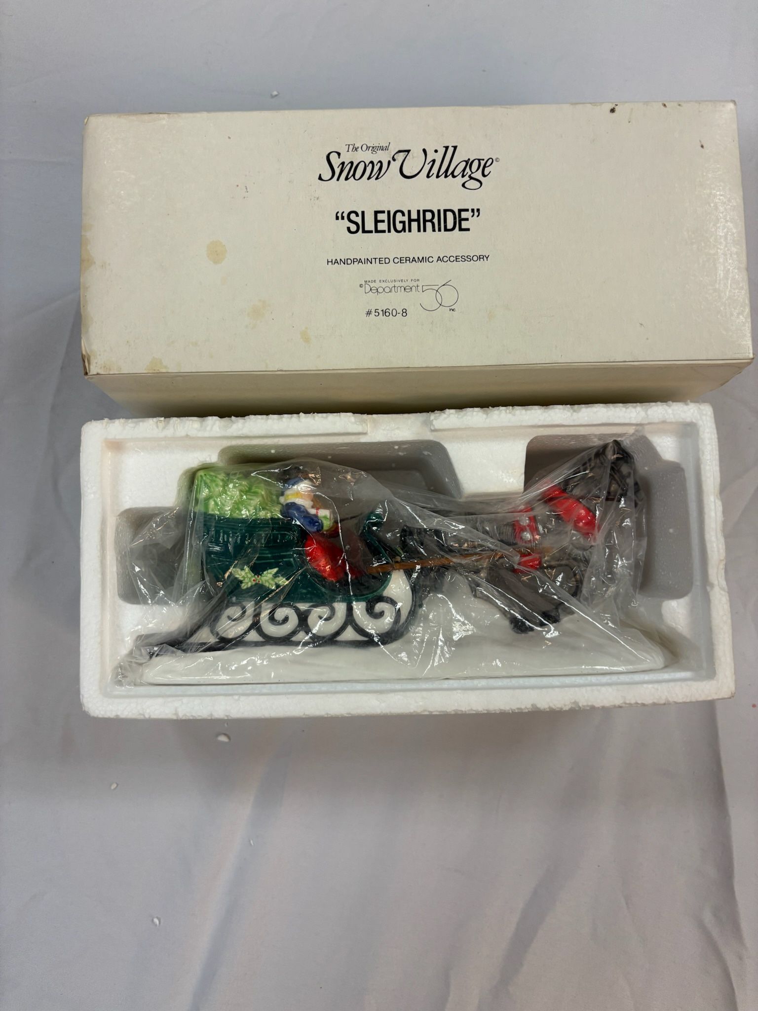 Item is in Perfect condition! Comes in original sleeve and styrofoam insert. There is some creasing in the upper right-hand corner of the sleeve. (See photo.) Department 56 The Original Snow Village SLEIGHRIDE #5160-8 Released 1990 Retired 1992 Handpainted Ceramic Amazing Detail!