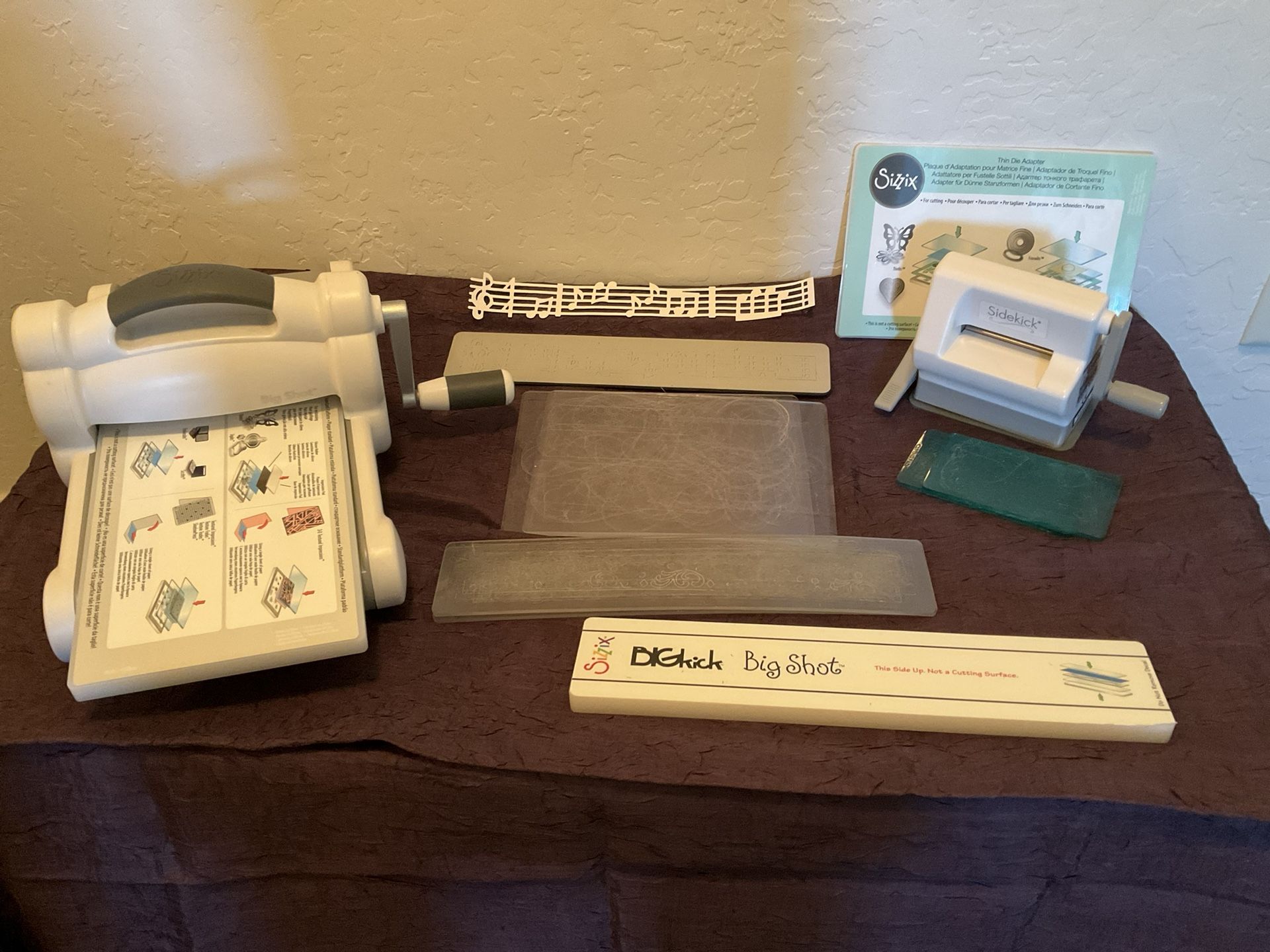 Sizzix Big Shot, Sizzix Sidekick and Accessories. Accessories include standard platform, thin die adaptor, extended spacer platform, 3 sizes of cutting pads, and one decorative strip die (Sheet Music by Rachel Bright 657343). Big Shot and Sidekick work with dies of other systems as well. Awesome starter pack , gift, or great addition to your scrapbooking or quilting collection.