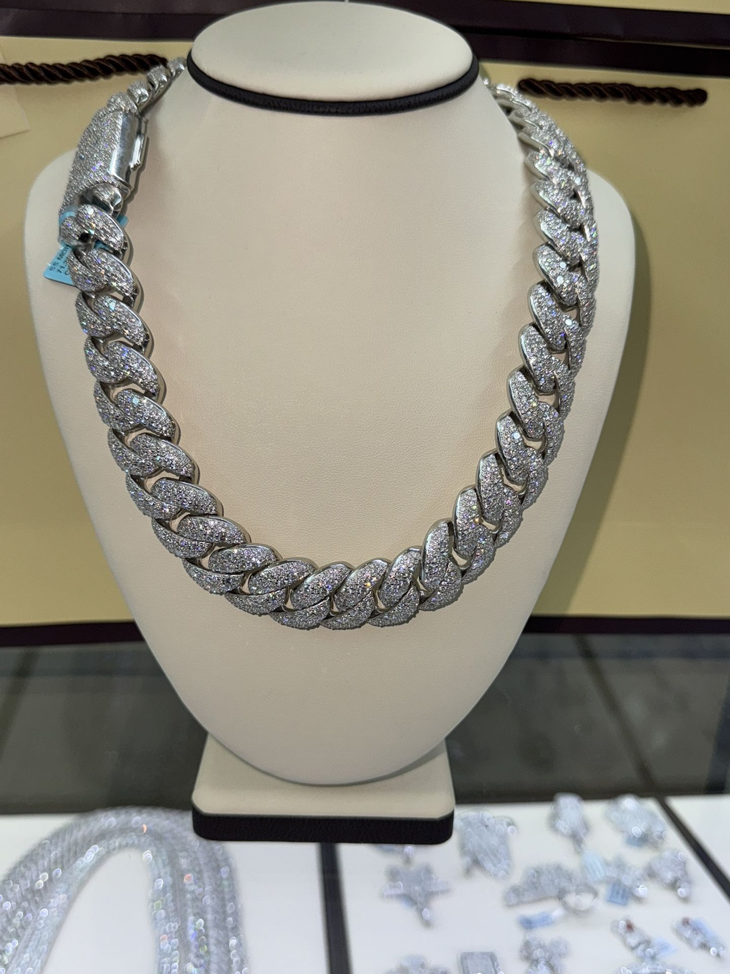 Iced out mosaic setting Cuban chain in a bold 22MM width and 22” length. Crafted with premium moissanite lab diamonds that shine harder than most natural stones and pass all diamond testers. The mosaic setting maximizes shine, giving the chain a unique and heavy look. ✔ 22” length – 22MM width ✔ Moissanite lab diamonds (passes all diamond testers) ✔ Mosaic setting for extra shine ✔ High-quality build for durability and style ✔ Resizing available if needed 💎 DM us for custom sizes, different styles, or matching bracelet options.