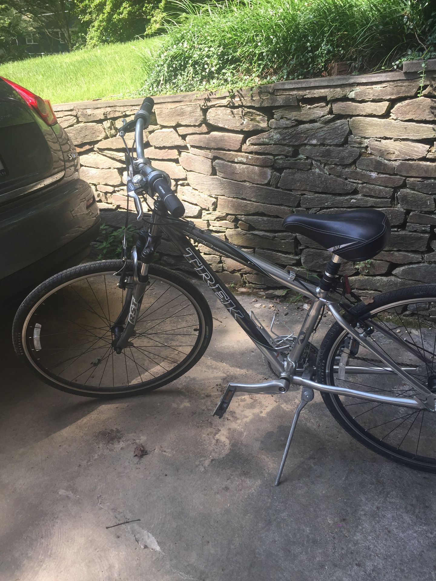 Black Trek Bike used about 5 times since purchase. Needs a new home and opportunity to be ridden. Includes Bottle holder and Helmet. (Helmet Not shown but will add later). In excellent used condition with no obvious flaws.