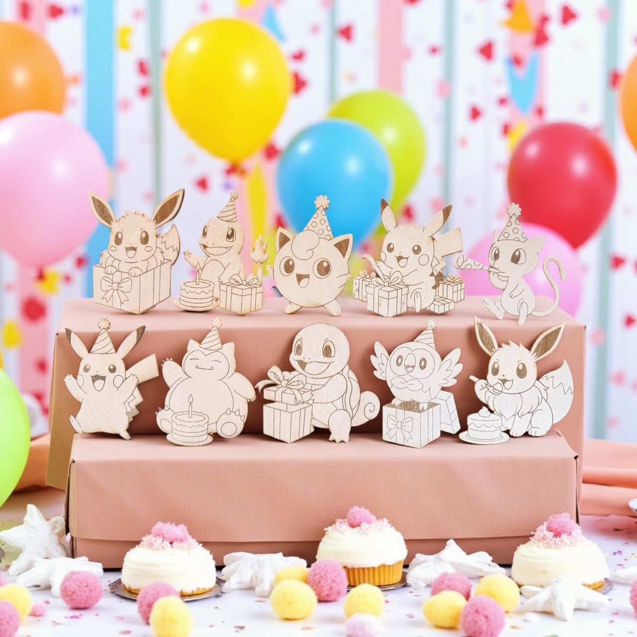 Bring some Pokémon fun to your next celebration! (Specific Pokemon requests available) Each wooden Pokémon character is ready to party — complete with birthday hats, gifts, and cake — perfect for painting and decorating. 🎨 Great for kids’ parties, craft tables, or gifts 🪵 Made from sturdy, laser-cut wood (approx. 4” tall) 🖌️ Paint, color, or decorate with markers, acrylic paint, or glitter 🎁 Use as party favors, decorations, or keepsakes 💫 Set of 9 for just $10! 🎂 Bulk discounts available for classrooms, events, or large orders ⭐ Custom orders welcome — custom Pokémon requests available! Ask about themed sets, names, or your favorite Pokémon characters! Make your party creative, fun, and full of Pokémon charm! 🥳💛