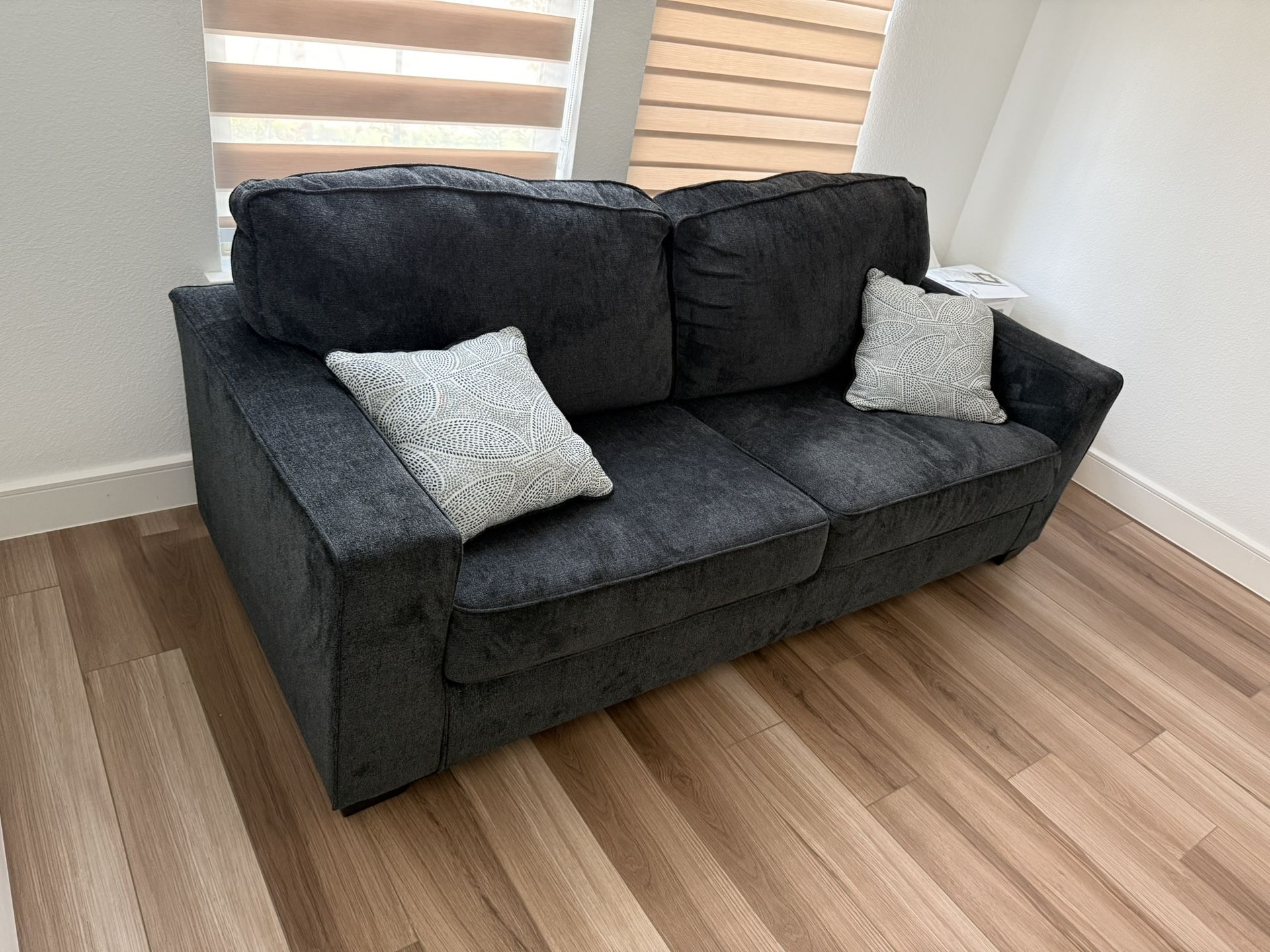 Essentially new sofa with queen size pull out bed with plastic wrap around mattress still on. Little to any wear on sofa, only 1 years old.