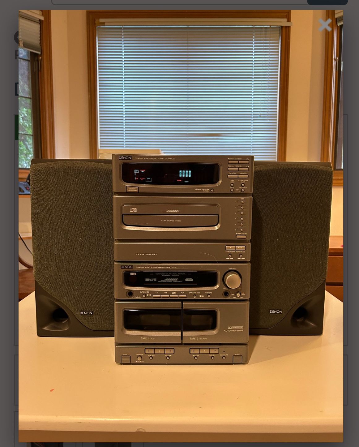 Denon D-C30 UTCM-C30 Personal Audio System/Tuner CD Changer W/ USC-C30 Pre-Owned Pre owned sounds system from denon. Features a six disc storage and changer system. FM receiver and AUX capabilities. Super wide sound, Dynamic Bass, Computer Play and full remote control system available. Remote not included. Everything has been tested and works but the tape deck won’t play tapes. The sounds from the speakers is very nice. This is perfect for any music lover. In good condition. Smoke free home, fast shipping, free shipping. Thank you for looking