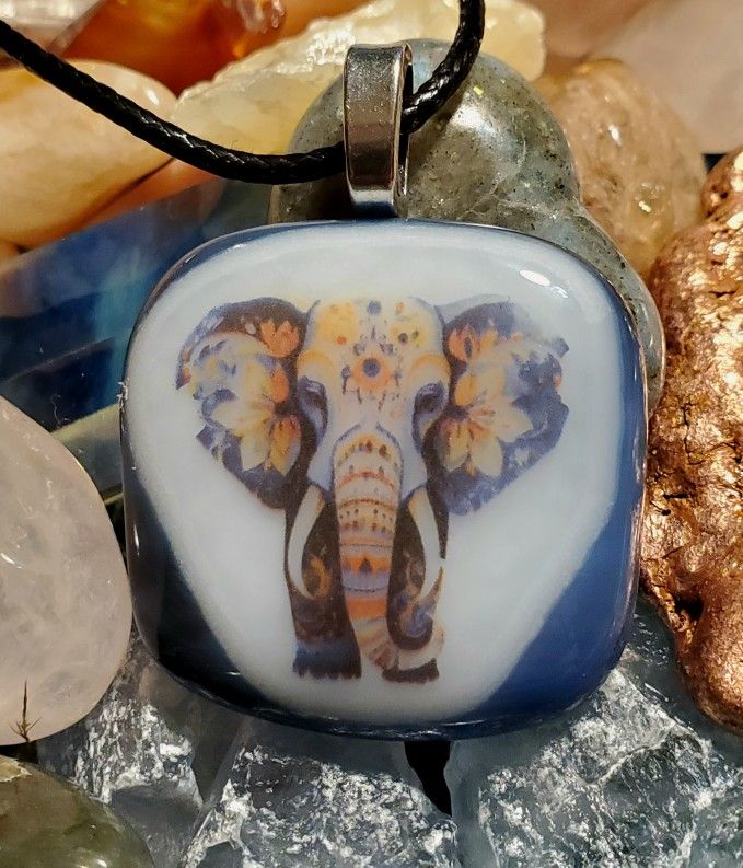 a beautiful fused glass pendant and original artwork by almasjewelryart made recently, a one of a kind pendant with a colorful elephant i call ellie, this piece I made by cutting and grinding the glass and fusing the 2 layers of glass together and adding the decal for the 2nd firing to complete this piece.. made with love and care at my home/studio ❤️.. almasjewelryart