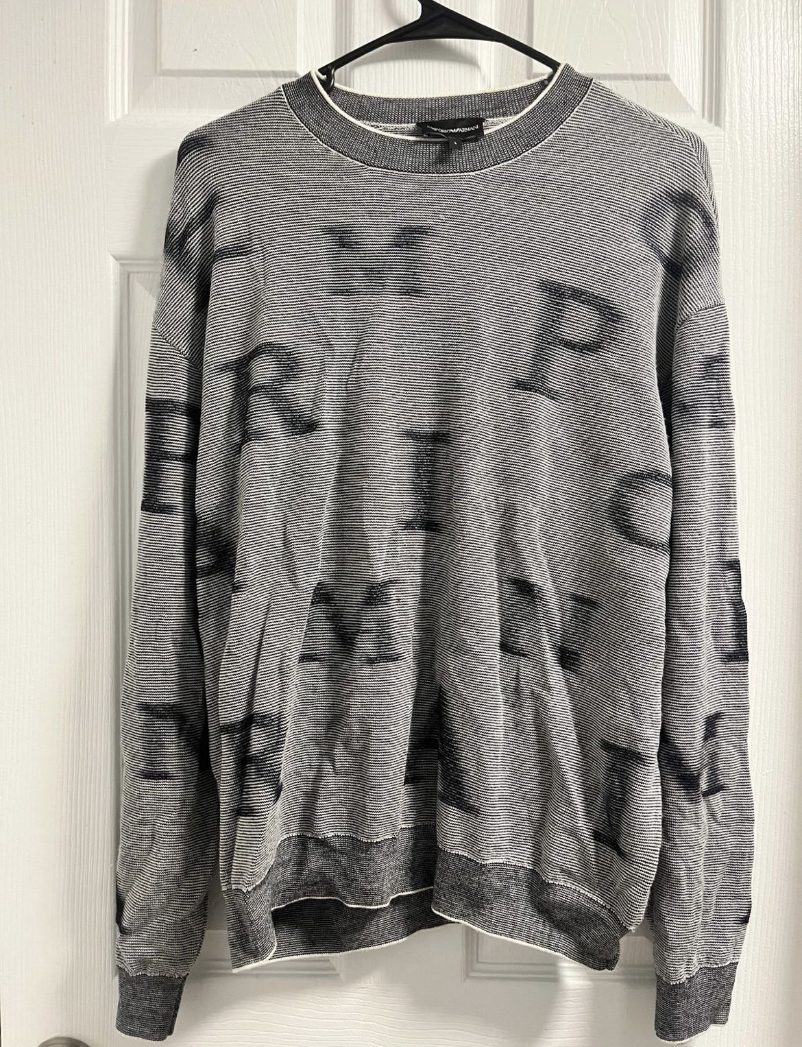 Upgrade your wardrobe with this stylish Emporio Armani men's pullover sweater. Featuring a modern design with scattered black letters over a gray knit background, this sweater blends casual comfort with a designer edge. Lightweight and breathable, it's perfect for layering or wearing solo during the cooler months. Brand: Emporio Armani Size: Large Color: Gray with black letter print Material: Cotton blend (see tag for full details) Style: Crewneck Pullover Condition: Gently used, excellent condition – no holes, stains, or significant wear. Features: All-over large letter graphic design Ribbed cuffs, hem, and neckline Designer label detail at neckline