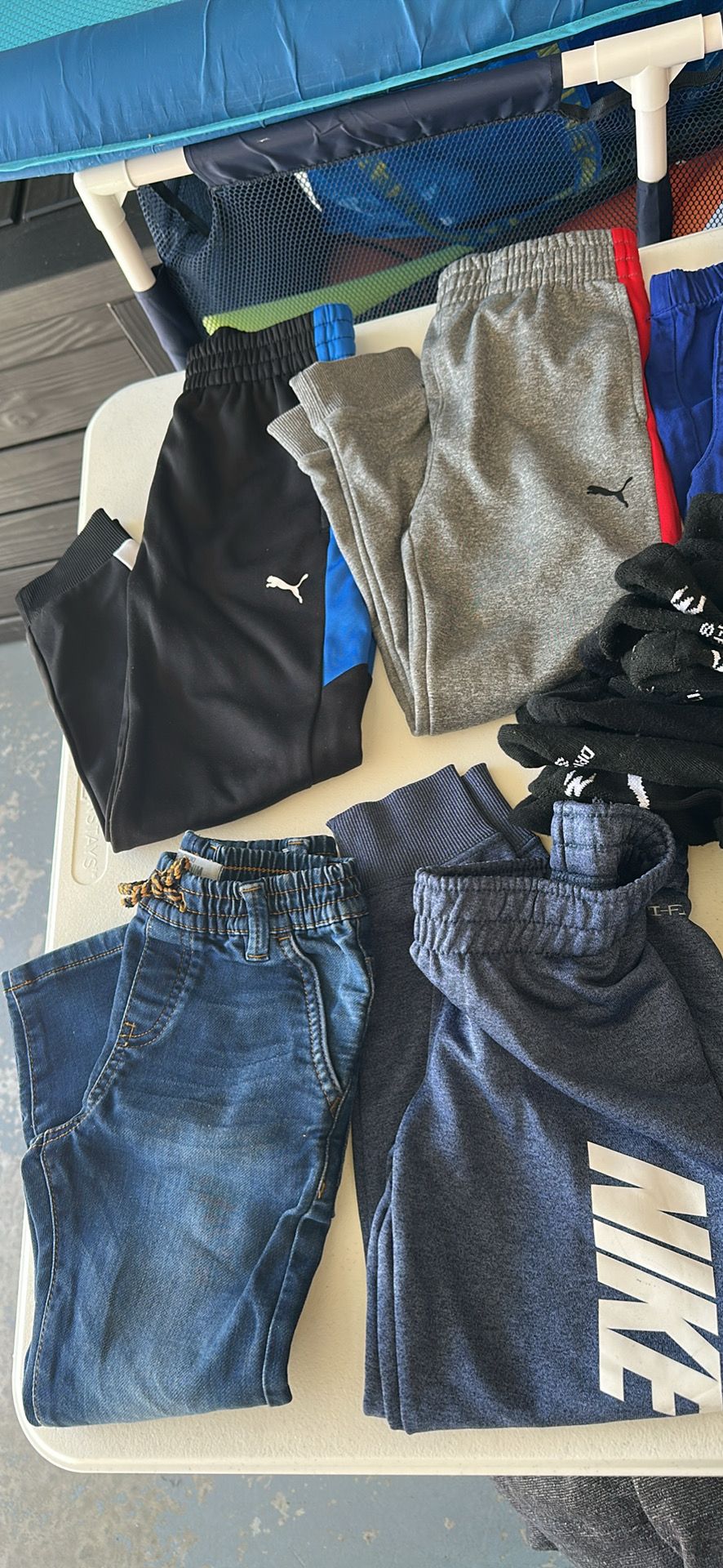 Awesome bundle of boys 22 pants size 5 and 6. 1 Red Soft Long sleeve Onsie+ 7 Nike Dri-Fit Black Socks+ some Puma and Nike athletic pants in black, gray, and blue. Also has some cool jeans and other casual pants in red, light blue, and dark blue. Good for school or just hanging out. Cash Only. Local Pick by Hunters Creek area.