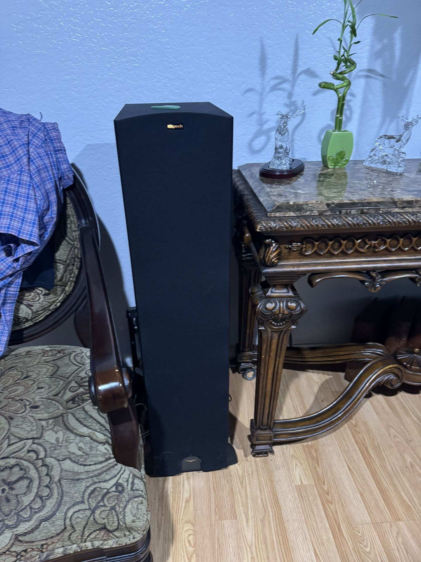 Set comes with two towers, a center speaker, and an amp. You're welcome to test them before buying. They work really well. One of the speakers from the towers is cracked but not noticeable and can be remedied with some good quality tape. And the amplifier works well and powers the setup just fine to whatever media I'm playing music from. But it does have some issues on some outputs it has and especially a loose component that turns off the unit if placed a certain way. This can also be fixed but haven't had time but hit the right spot and the amp will power these speakers easy. ***I have powered klipsch sub that i will sell separately so feel free to ask about it.