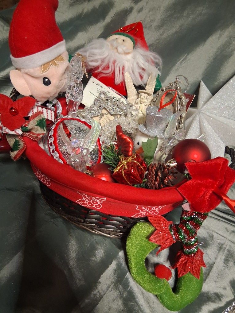 Perfect just in time for the holidays. This little Christmas basket is full of Christmas tree ornaments, Christmas tree star topper, and Christmas decor. Along with cute little Christmas basket!