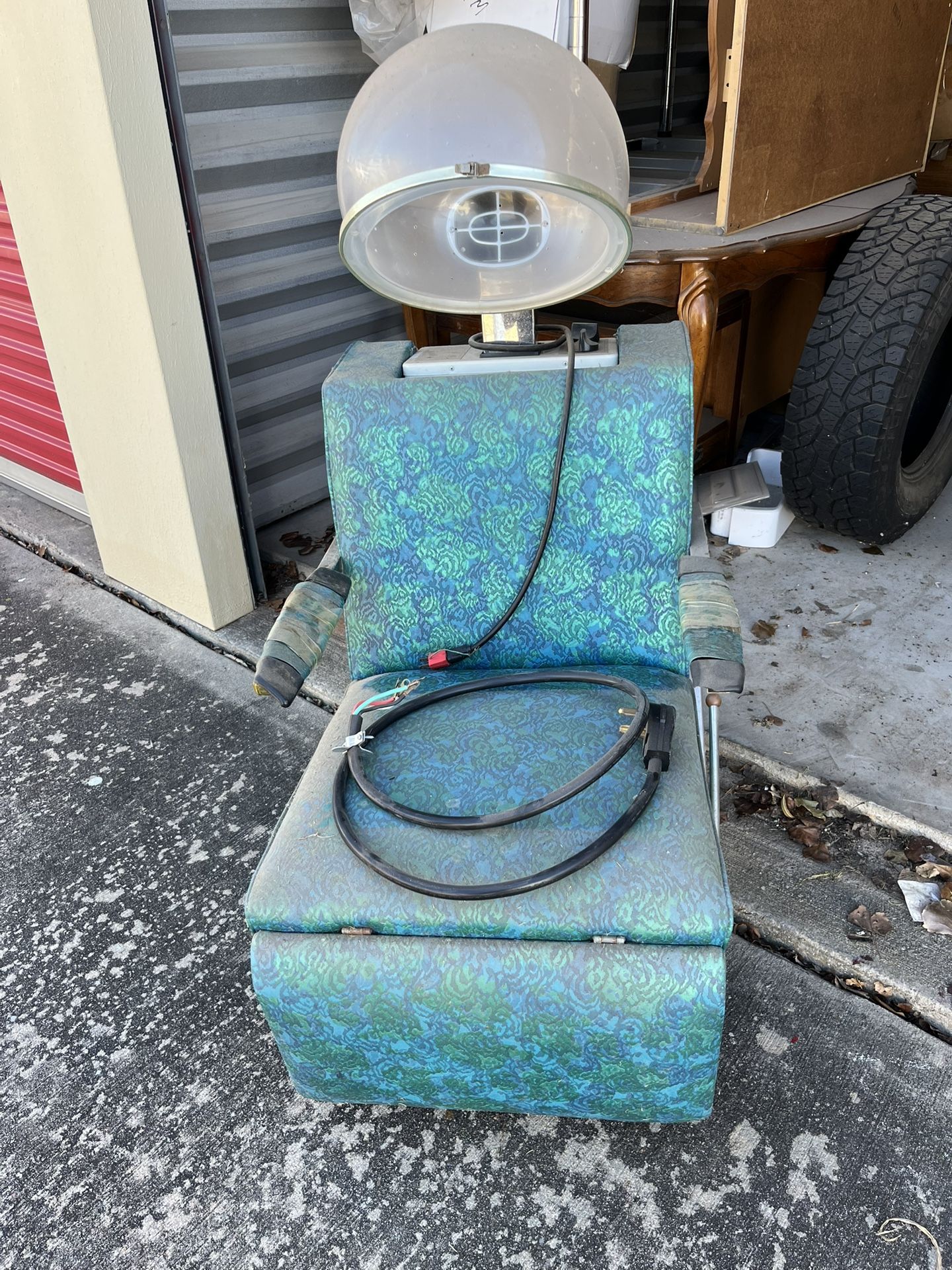 Antique Dryer Chair with hooded Dryer works great! Arm rest are cracked but I believe can be fixed… Just needs to have the dust wiped off from sitting in storage