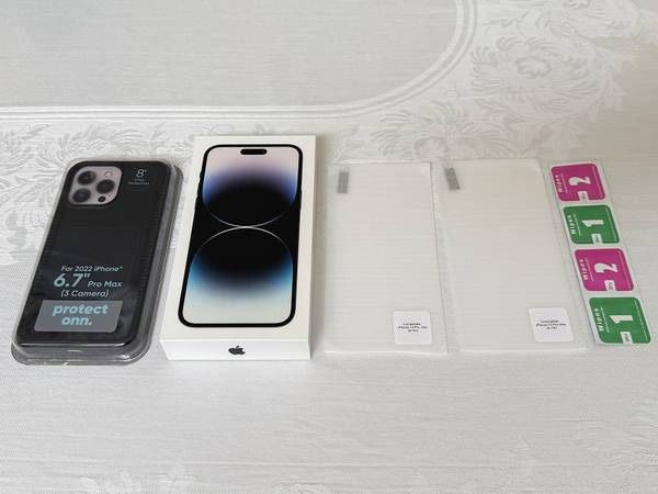 This is a lot of Apple iPhone 14 Pro Max items, including the original Apple box, Onn. 8' drop protection case (very rugged and sturdy), and two unused 9H tempered glass screen protectors. The protection case has been used, but everything else is brand new. Selling the whole lot for $15.
