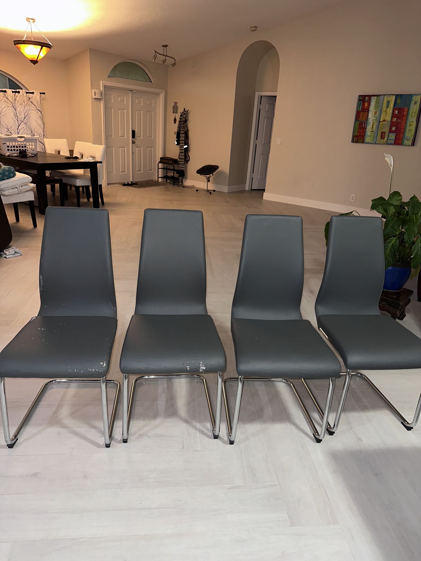 4 Modern Gray Chairs – $65 for All Set of 4 modern gray dining chairs in good used condition. The foundations and support frames are solid and sturdy — they sit well and feel stable. Some of the chairs have minor peeling on the surface from normal wear, but they’re still fully functional and look great in a dining space, office, or breakfast area. Priced accordingly at $65 for all four (not selling separately). Message me if you’re interested!