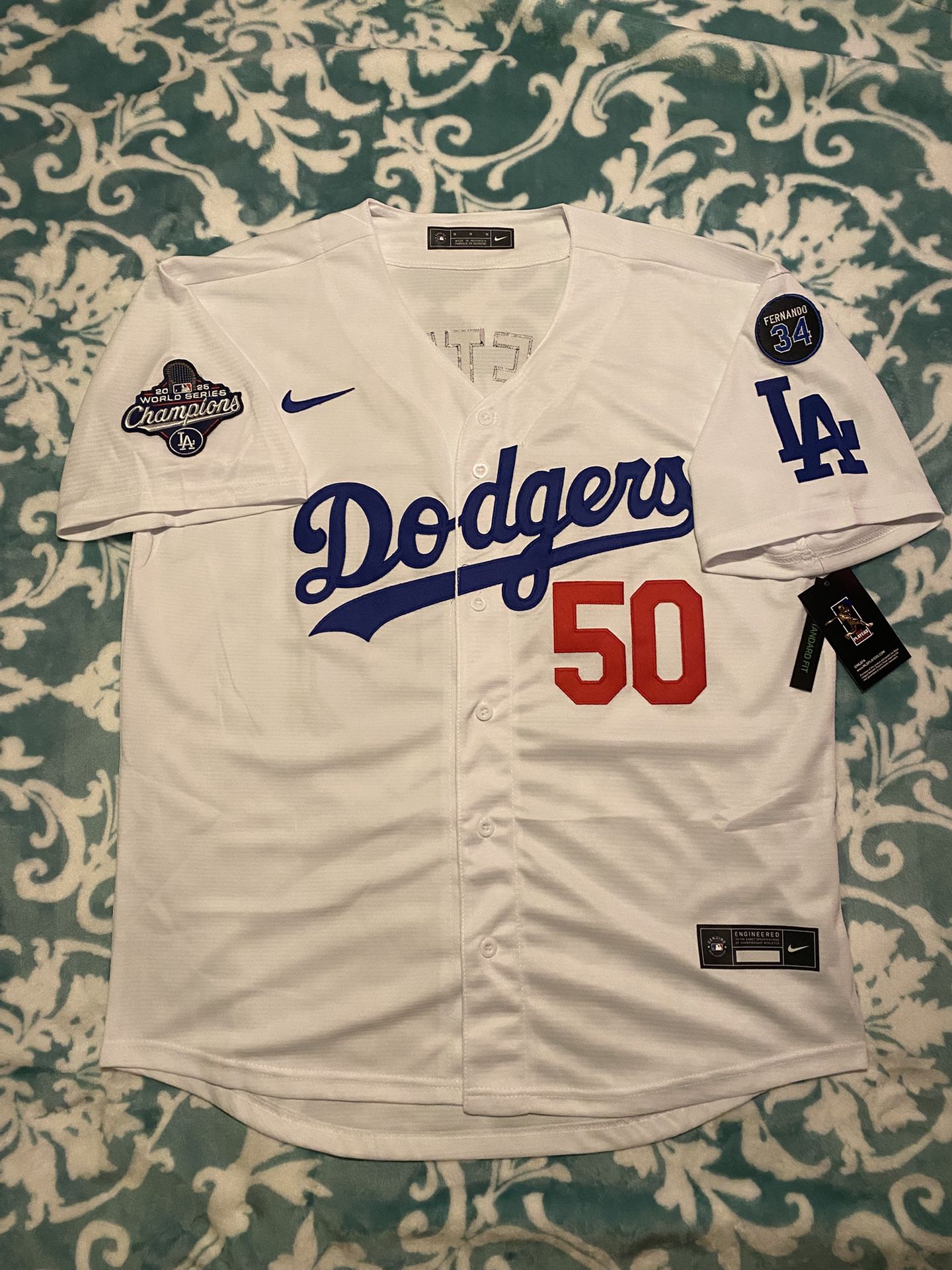 Brand new with tags π₯ Official Nike / MLB jersey β’ Player: Mookie Betts #50 β’ Team: Los Angeles Dodgers β’ 2025 World Series Champions patch on sleeve π β’ Fernando Valenzuela #34 tribute patch β’ White home jersey β’ Never worn π² Price: $55 π Sizes available: X-Large, XX-Large π Menβs sizes only (No women sizes) π Located in: Montebello, CA No deliveries must pick up. β No trades Serious buyers only