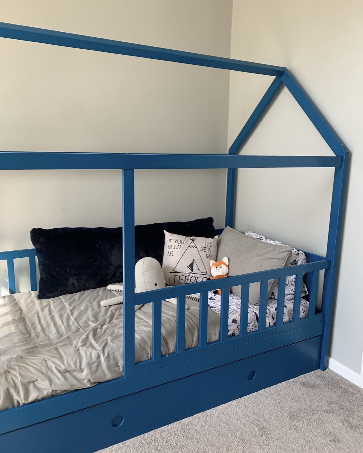Great condition! Blue house bed, with trundle. Side rail and foot rail are not included. Bed includes head rail and mattresses. Option to buy bed frame without mattresses.