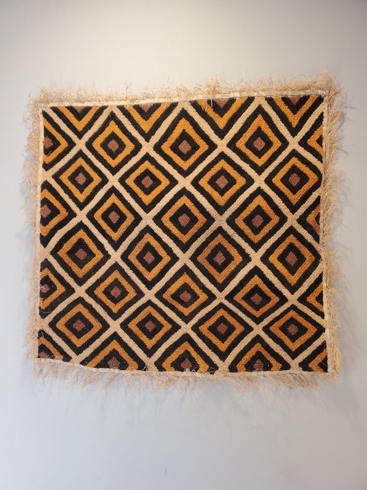 Made in the republic of Congo, Africa. BLACK , brown , beige and GOLD colors with geometric shapes and symbols makes this textile one of kind . This cloth was embroidered with no sticting visable on the back. These cloths are durable. They can be pinned on the wall, framed and even used as fabric as clothing or upholstry.