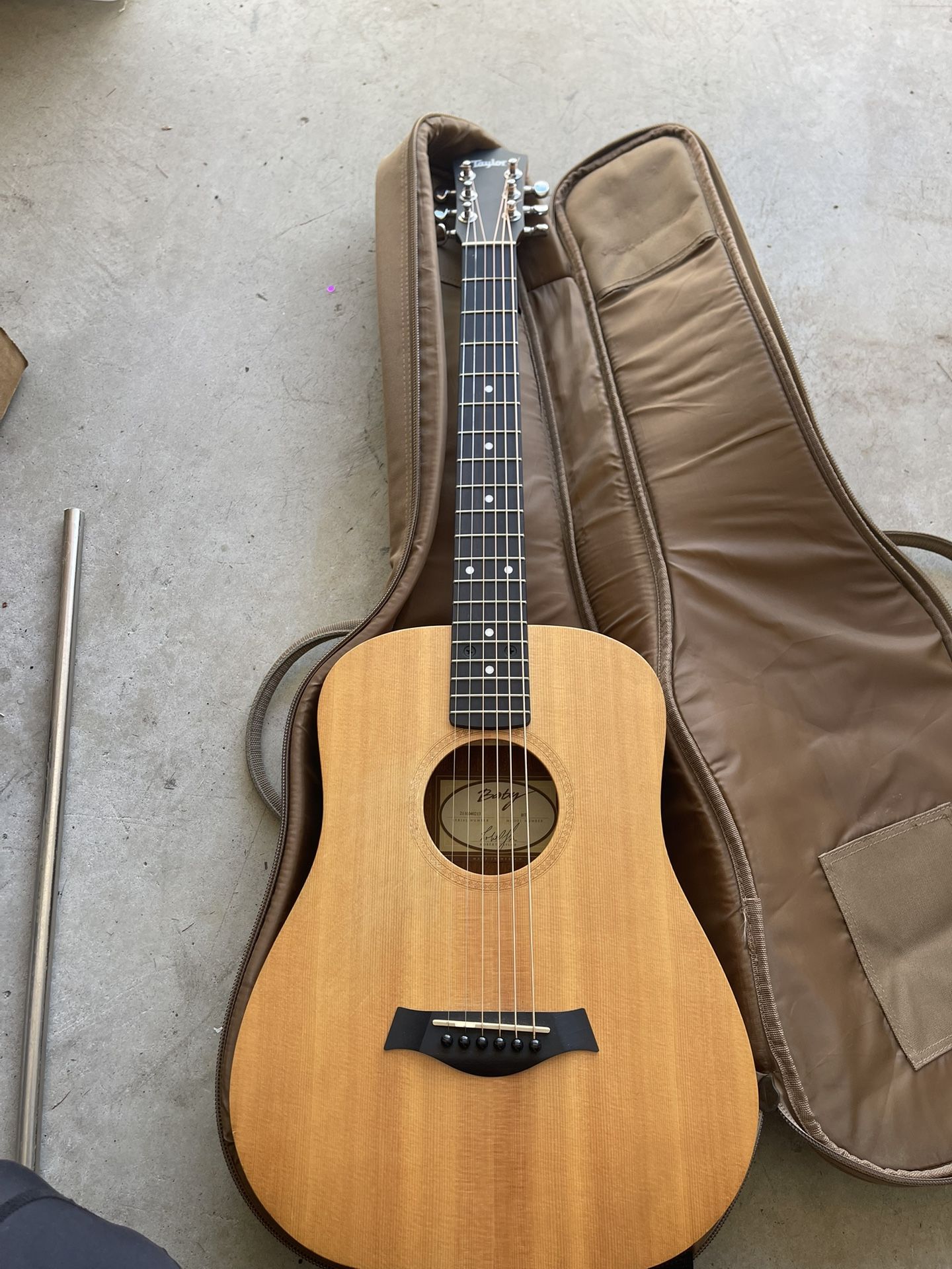 Like new left-handed Taylor baby guitar comes with case, tuner and strep