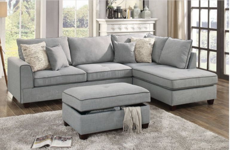 This beautifully designed sofa collection features a traditional crafted unit with large plush pillows and seating in summer hues. It also includes a reversible chaise and matching storage ottoman. Available in steel, light grey, or mocha Doric fabric. Sectional Sofa + Ottoman Item # F6543 Color: Light Grey Materials: Dorris Fabric Plywood base panel with solid pine frame Wood legs Pocket coil seat cushion with foam encasement Dimensions: Sectional: 104″ x 75″ Reversible L/R Chaise: 75″ x 34″ x 35″H ; Sofa: 70″ x 34″ x 35″H Ottoman: 35″ x 24″ x 19″H Some Assembly Required