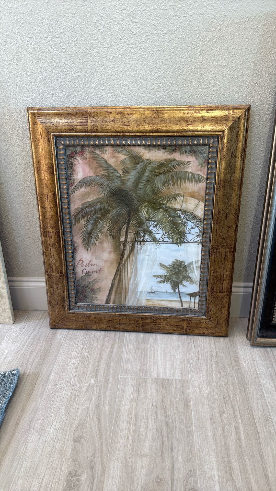 Elegant framed tropical artwork featuring a tall palm tree overlooking a serene beach scene with ocean views, sailboats, and a shaded terrace. The soft pastel tones and coastal theme bring a relaxing, resort-style feel to any space. The artwork is set in a beautiful, substantial gold-toned frame with decorative beaded detailing, giving it a classic, upscale look. Perfect for a living room, bedroom, office, or vacation home décor. Details: • Title: Palm Court • Size: 23.5” x 28” • Coastal / tropical theme • Ornate gold frame with beaded trim • Neutral, calming color palette • Excellent condition • Ready to hang Price: $40 Pickup: Local pickup