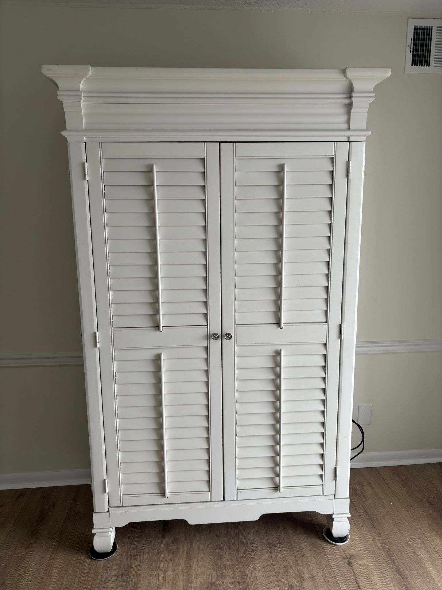 High-quality Off-white armoire storage cabinet. 6’7” tall goes through regular height doorway. 50 inches wide 26 inches deep. TV and other items shown inside cabinet not included.