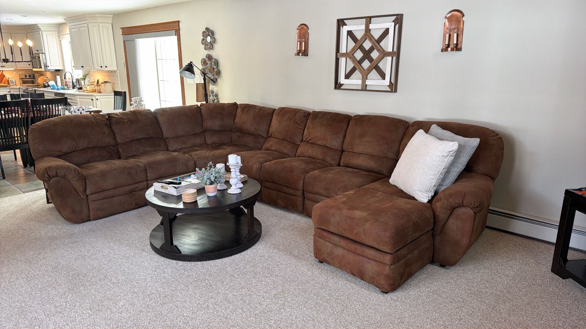Large microfiber sectional sofa with a chase lounge and two recliners. Sections hook together. There is also a La-Z-Boy swivel/rocker mechanical recliner that has damage (tear) to the fabric.