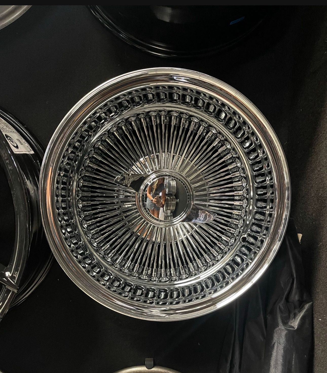 (4) wheels (4) 2 bar smooth chrome knockoff spinners (4) 5 lug adapters (1) lead hammer) PRICE IS FIRM Tires are an additional $400.00 13” tires $500.00 14” tires 14x7 Wheels only $1500.00 1500 San Fernando rd. San Fernando 91340