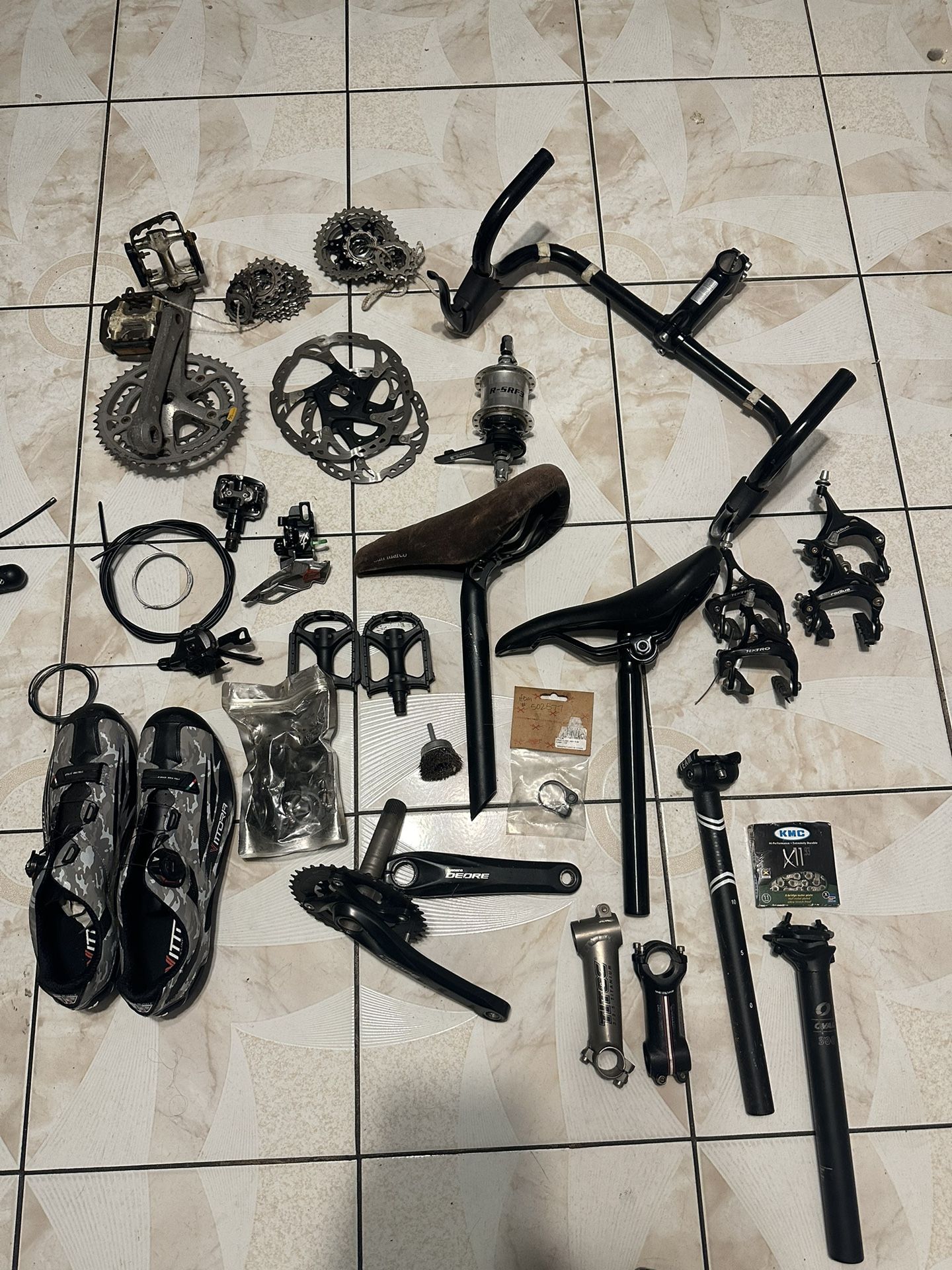 Have miscellaneous bike parts some are slightly used and others are new. Bike shoes are size 10-11 I believe , brand new never worn . Ask for part individually or everything can be sold together.