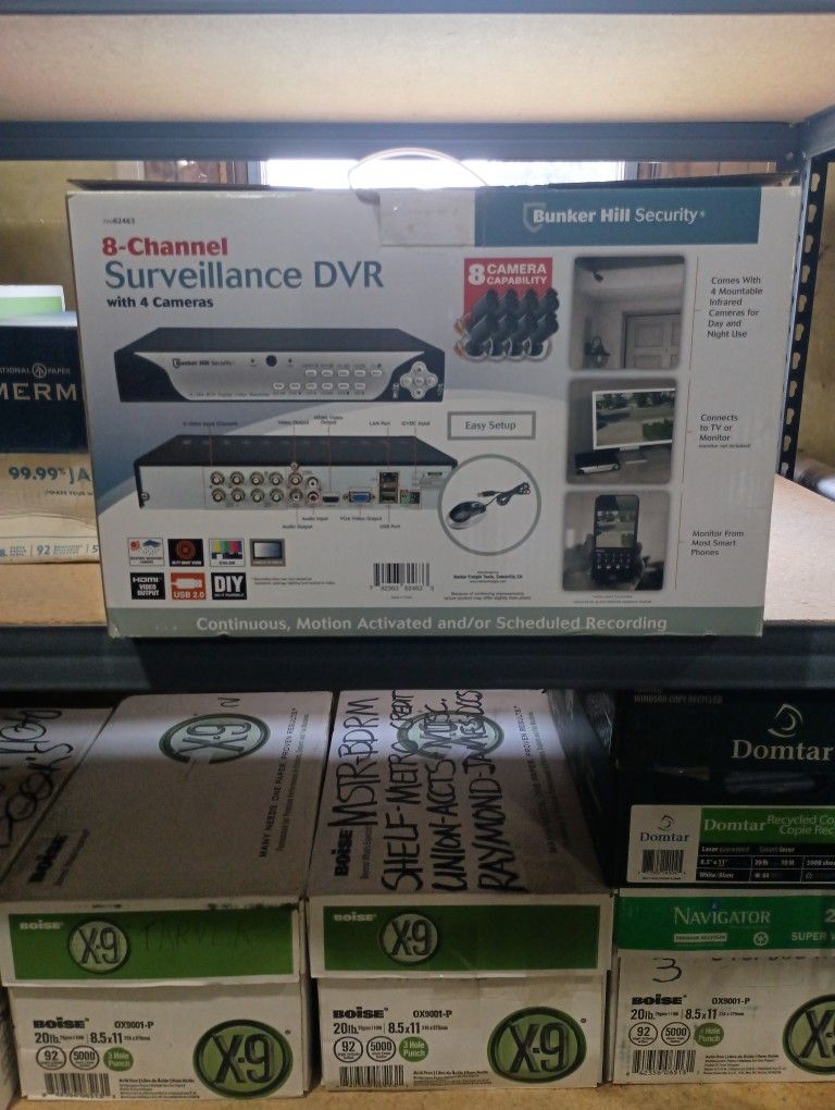 Bunker Hill security surveillance DVR with four cameras. Records playback and transmit video. Monitor from most smartphones. Includes four and door outdoor color cameras with infrared night vision. Easy setup and navigation with mouse. 8 channel capability add up to four more cameras. Continuous motion-activated and or scheduled recording. 500 GB hard drive pre-installed.