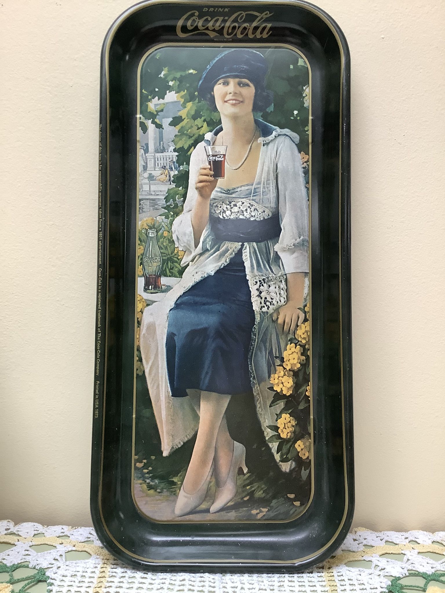 Vintage COCA COLA metal tray— 1970’s Vintage repro of 1921 LADY IN GARDEN tray, size 19 inches by 8 inches. This lovely tray is perfect for serving or wall display. Lightly used condition. Please contact me with any questions.