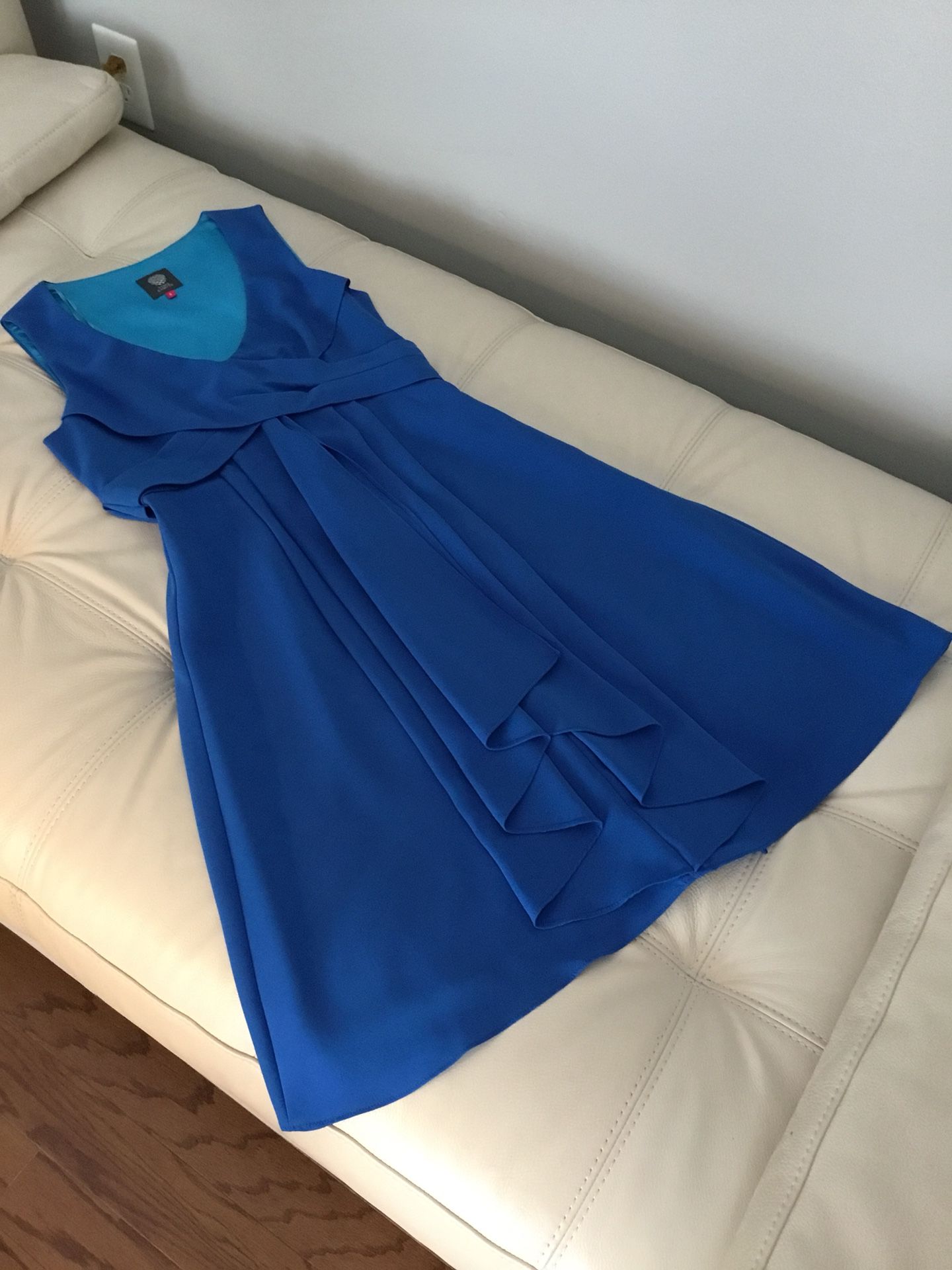 Vince Camuto dress. UK Blue. Size 4. Beautiful dress. Worn once. No stains including no arm pit stains. Knee length. Ties in the back. These measurements may help. These are when the dress is laid flat. Across shoulders 13 inches, under arm pit 16 inches. It is kind of full at the bottom, but somewhat fitting a little above the waist. I would say at the rib cage area. It’s approximately 13 inches.