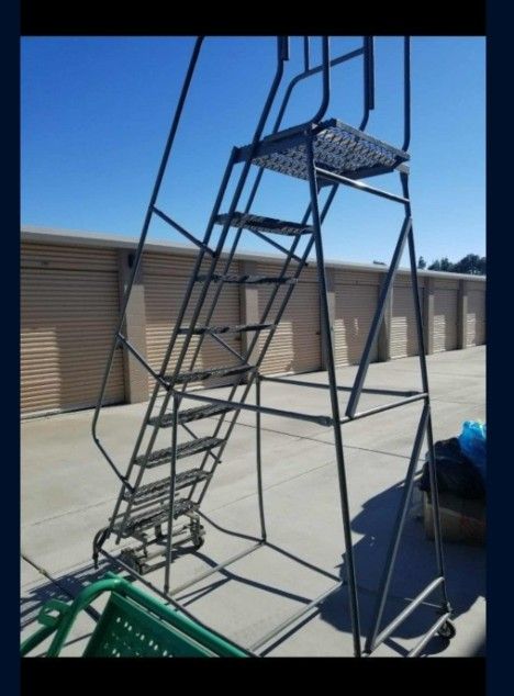 This is a 9 step portable rolling warehouse ladder/staircase in good condition. It can be easily moved around as needed and locked in place to keep it from rolling for safe climbing. There is a platform with a partially caged area at the top where you can stand to work. It is approximately 11' tall x 6'5" long x 2'9" wide. Delivery available, fee will depend on location.