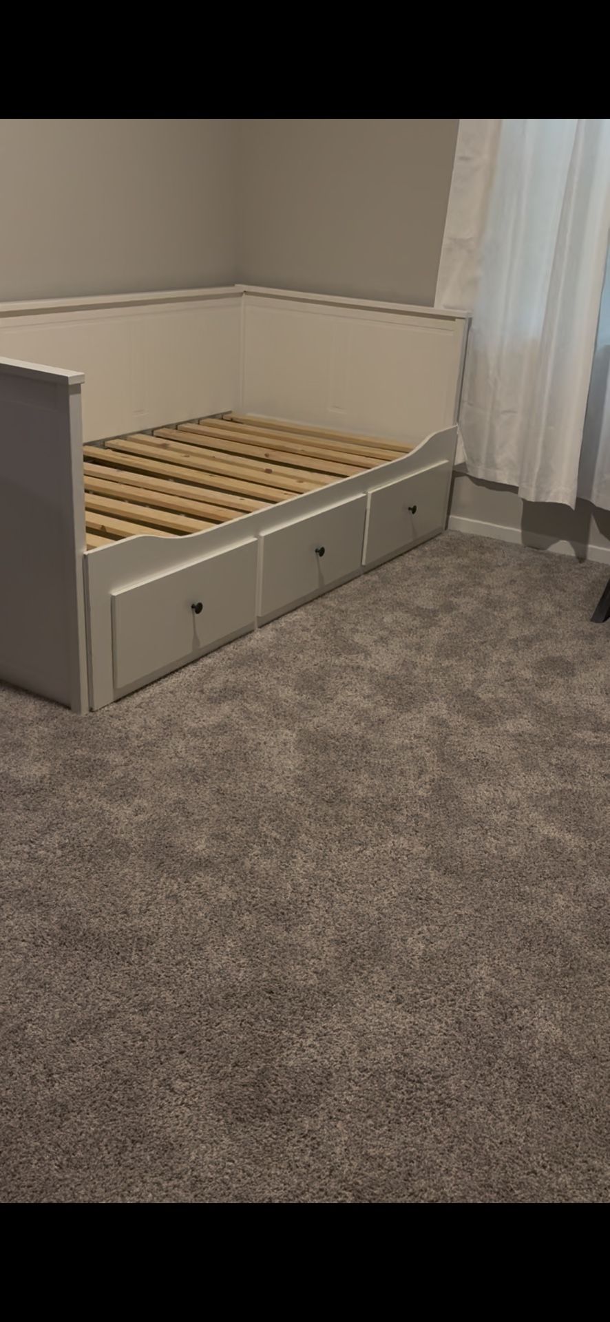 Bed can convert in twin or queen bed. Is in good shape. It has bottom’s door for storage.