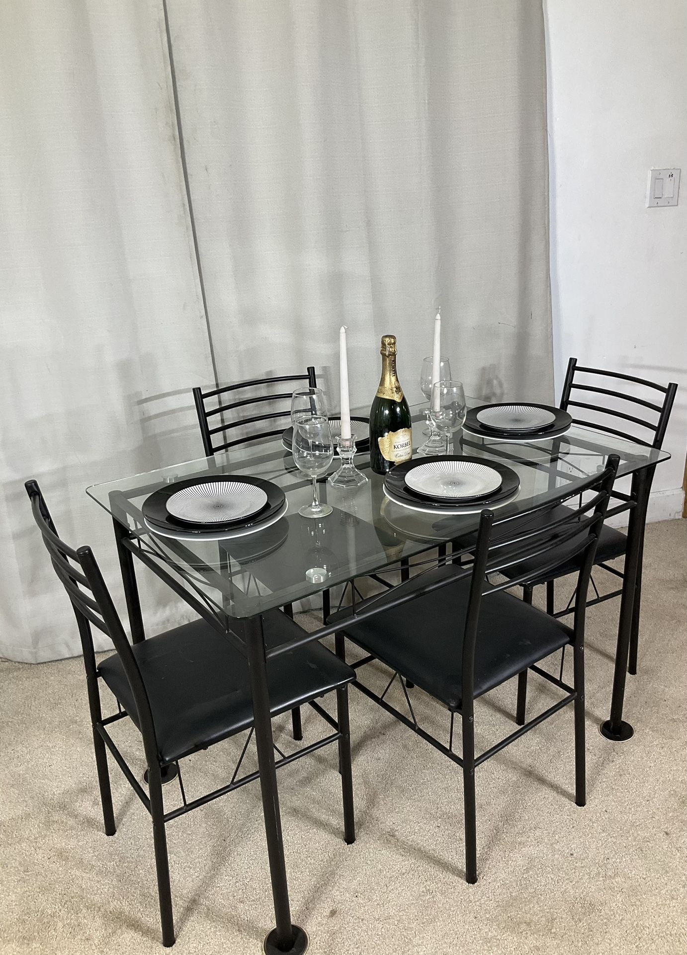 PICK UP ONLY * PRICE IS FIRM Raising the bar on how beautiful simplicity can be this glass and iron dining set packs plenty of appeal in a compact design, while adding elegant dimension and style. The tempered glass top lifted on matte black metal frame, beautifully showcases 4 matching chairs with black faux -leather padded seats. Solid, sturdy construction. Great condition. Hablo español.