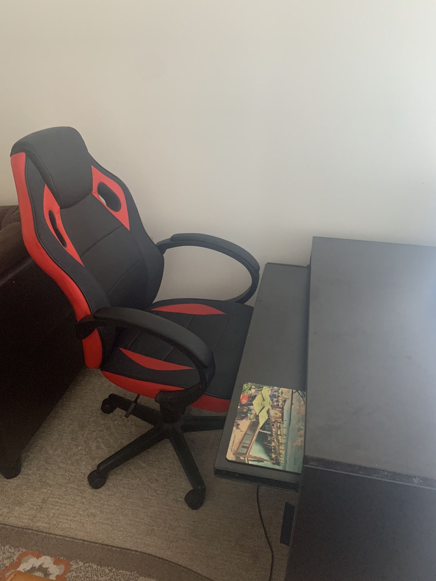 Hardly used expresso wood desk with keyboard tray and cool red & black gaming chair. Sold as a set for $180. Desk dimensions are: 41.5”x24”. It’s compact and can fit into any space.
