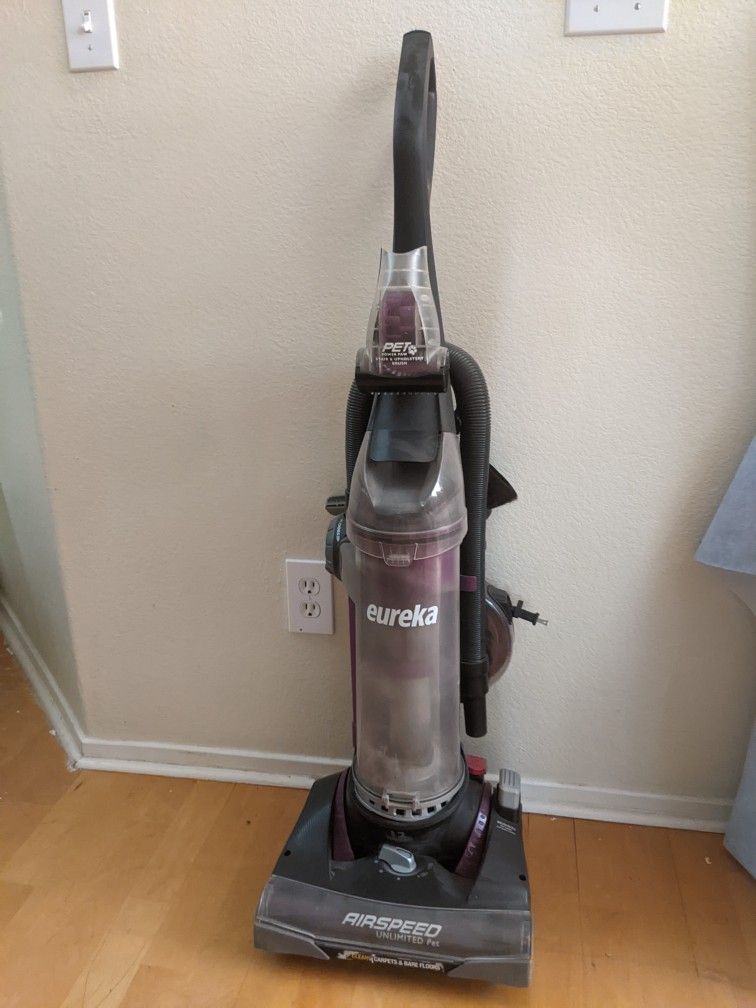 Gently used Ereka Airspeed Pet Upright vacuum with stair and hose attachments with extra pet accessory (shown in photo). Despite the name, this was used in a pet-free, smoke free home. Hasent seen much use since we went to a different handheld vacuum. Works perfectly!