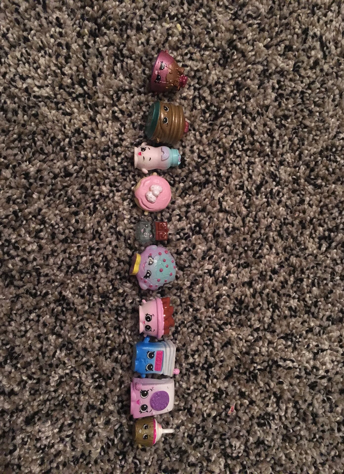 It has a cookie, a bowl with chocolate chips in it, a cake, a bottle of sprinkles, a bag with sugar, a bag with flour, pancakes, a cupcake charm, a chocolate charm, and jello.