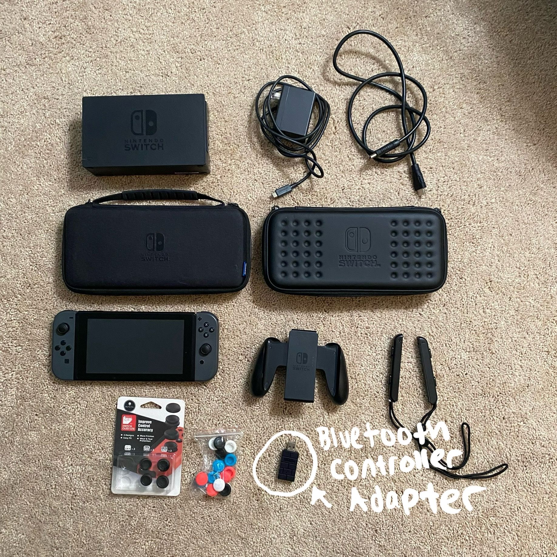 Nintendo Switch - Read description Selling a Nintendo Switch. Please read description carefully. Switch has little to no damage and is fully functional. Factory reset. Screen is in excellent used condition. All cords are working and don’t have damage. Tablet still has OG kickstand. Please note I very rarely used this - I have lightly tested the joy-cons myself in 2k and in Minecraft. I have not noticed any stick drift, but please know I only tested this myself for a few minutes. Buyer beware of infamous stick drift. - Read for more details about what’s included in the bundle. Grey Nintendo Switch bundle - $155 - Comes with OG dock, OG power adapter, OG joy-con controller grip, and OG joy-con bumper/wrist straps. - Also comes with HDMI cord. Free add ons: - 8BitDo 2 (Bluetooth controller adapter to allow use of 3rd party controllers). I never used this so it’s untested but I’m including it in the bundle. - Black Hori Nintendo Switch Travel Case - premium Black/Grey Hori Nintendo Carrying Case w/ Handle - Joy-con finger grips