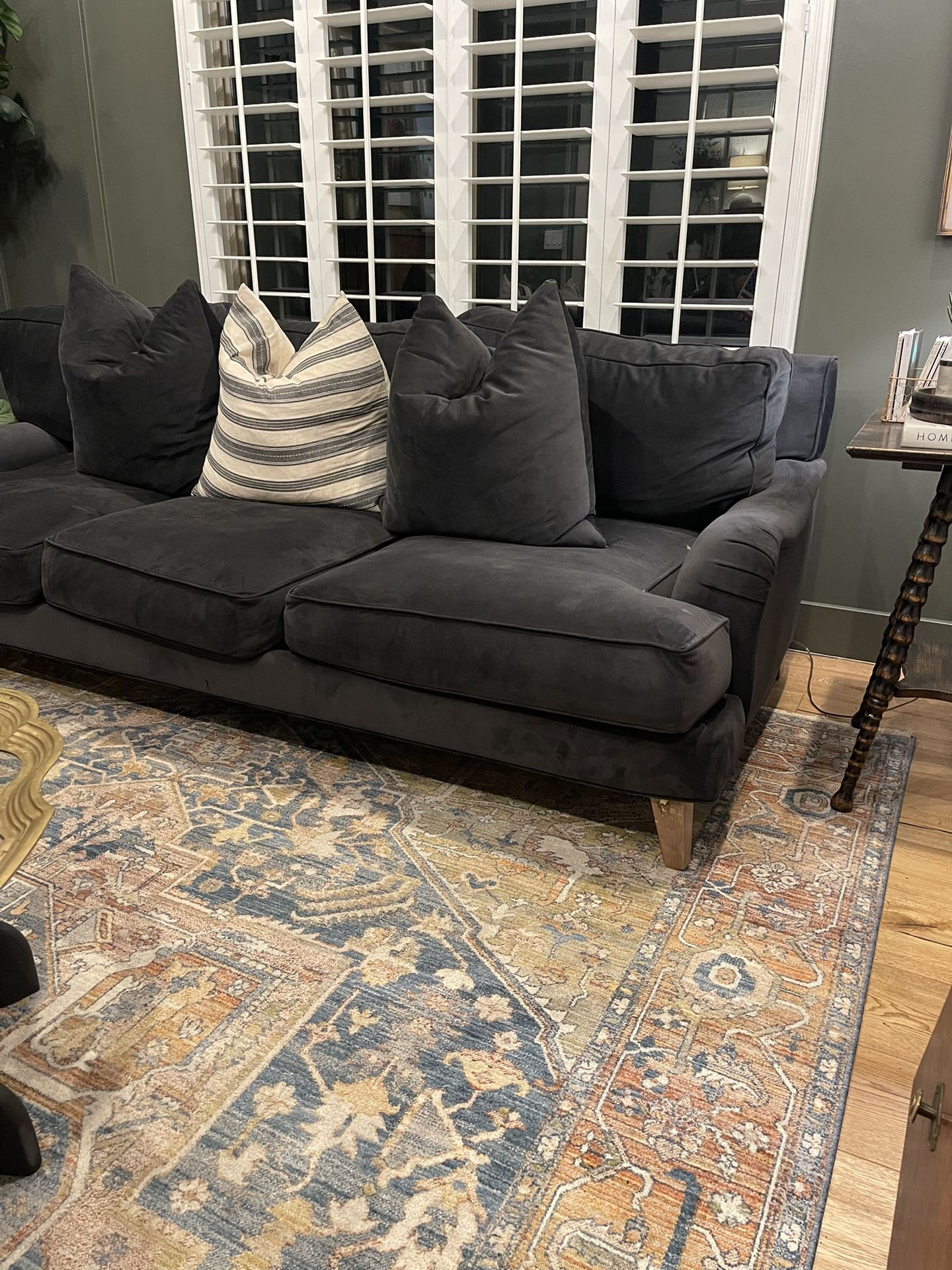92 x 42 x 32 such a great couch and neutral! Can go in any room and with fun pillows be such a statement piece! One of the legs on the bottom needs to be reinforced, but that’s an easy fix for someone that knows what they’re doing!