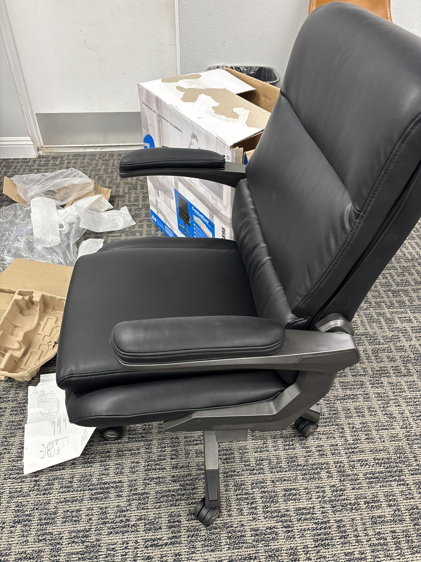 La-Z-Boy manager office chair in black faux leather, Costco edition. This was a new open-box storage unit find. As seen in pictures i emptied box to check the parts and assemble it. The chair itself is brand new and has never been used. Everything is in perfect condition – no scratches, tears, or wear. Ready to sit in and roll right into your home office or workspace. Details: • Brand: La-Z-Boy • Style: Manager / executive office chair • Store version: Costco edition • Color: Black leather • Padded seat, back, and armrests • Adjustable height and tilt • Swivel base with rolling casters Local pickup only in Encinitas. Cash or Venmo. ⸻ La Z Boy chair, La-Z-Boy office chair, manager chair, executive chair, Costco office chair, black leather chair, rolling desk chair, ergonomic office chair, swivel office chair, computer chair, home office chair, padded office chair, new office chair, storage unit find, Encinitas furniture, San Diego office furniture
