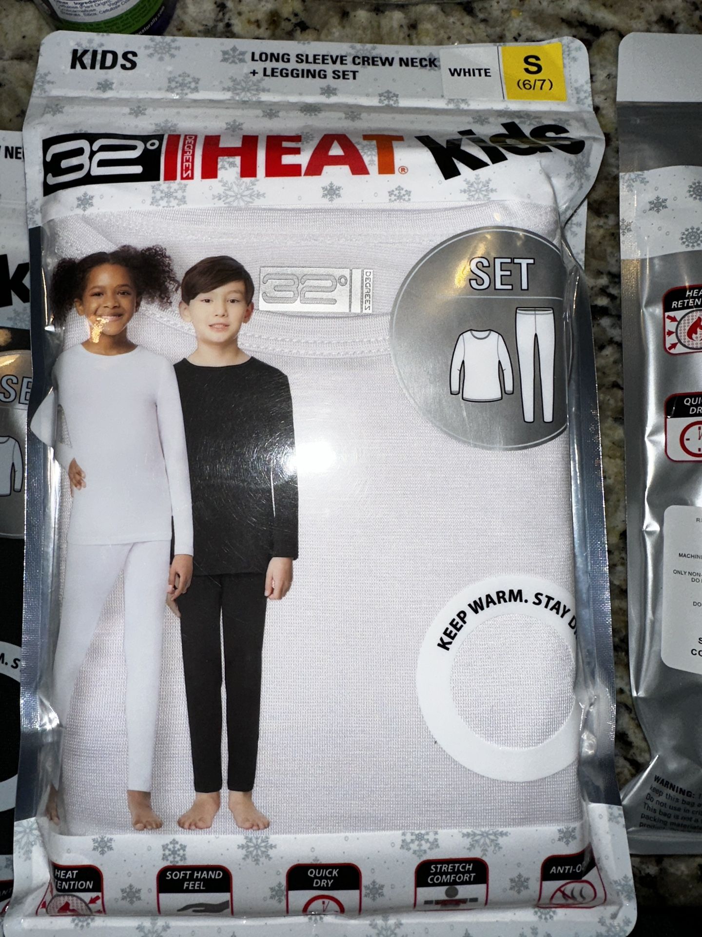 32 Degree Heat Set - Kids size small (6/7) Long sleeve crew neck and legging set Comes in either a black set or a white set. I have 3 set of each color. Asking $10.00 per set.