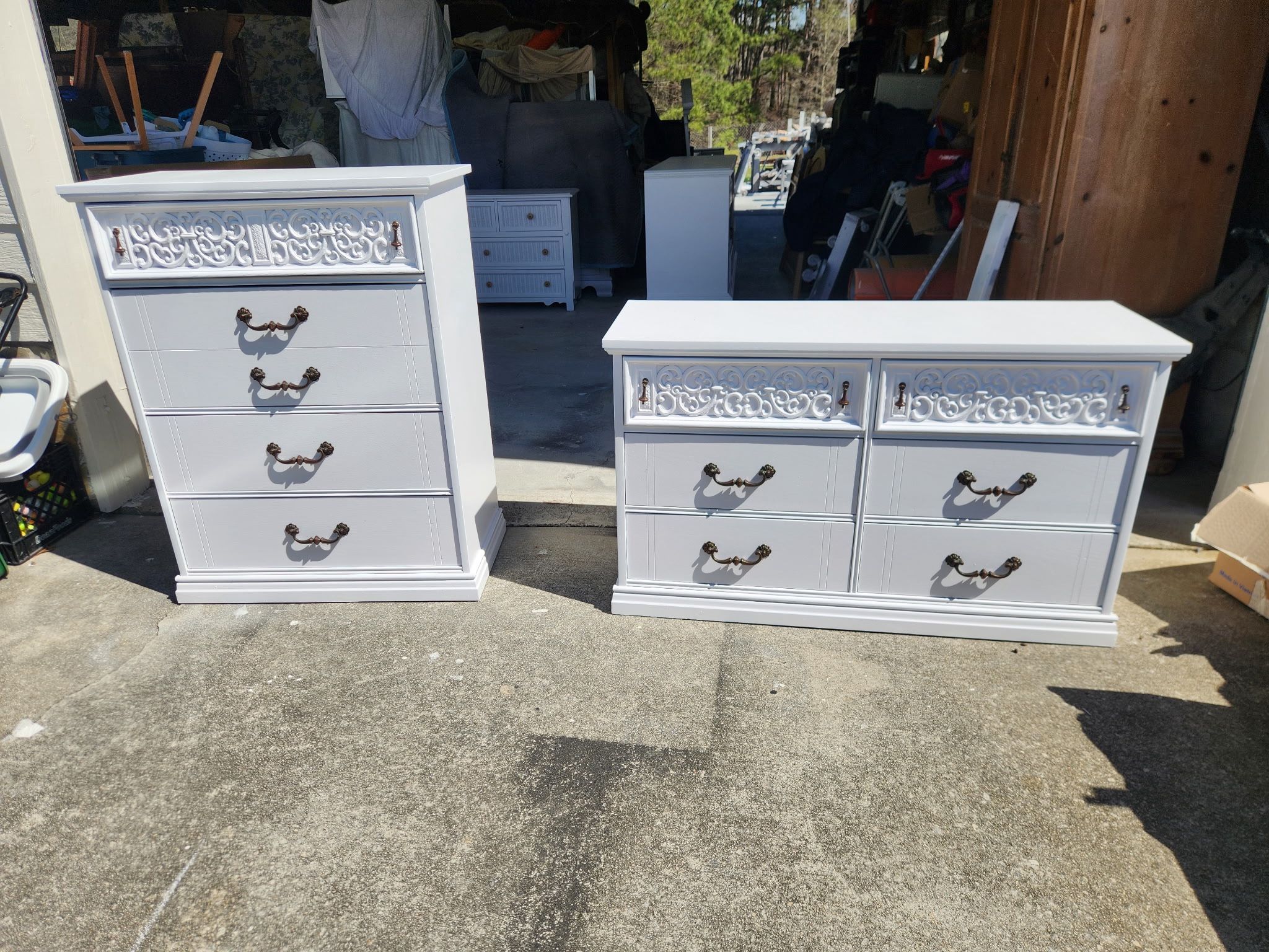 Refinished Bassett dresser and chest of drawers in pure white. All drawers clean and in working condition; minor cosmetic blemishes due to age. Solid wood. Measurements: Dresser 50x30x18 Chest 34x45x18 $300 for the set. Cash. Pick up in Stockbridge. We can deliver for a fee.